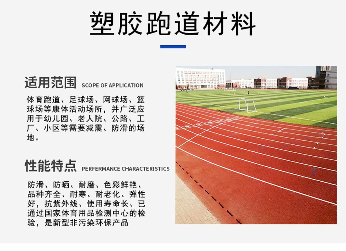 塑胶跑道面层材料主要为聚氨脂(PU)塑胶及三元乙丙(EPDM)橡胶,其优点具有:弹性优良,接着力强、耐磨、耐酸碱、抗老化,全天耐候性、环保、阻燃、防尘、无菌、无接缝、清洁、养护简单,颜色鲜艳、有利于美化环境及提高学生参与运动的兴趣。